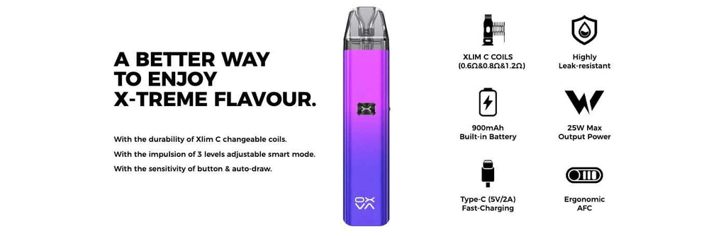 The XLIM C is a continuation of the XLIM series from Oxva, designed for offering an X-treme flavour to vapers. The Oxva Xlim C Pod Kit features a 900mAh internal battery and a TPD-compliant pod to fill vape juice, compatible with three Xlim mesh coils(0.6Ω, 0.8Ω, and 1.2Ω), which enables you to vape both in an MTL(Mouth to Lung) and an RDTL(Restricted Direct to Lung) style. besides, the Xlim C device has a 25w max output power and an ergonomic AFC adjustment, giving you three choices of smart mode that can automate your installed coils. What’s more, once you run out of battery, you can recharge it up to 80% in just 30 minutes via a Type-C USB cable. This pod vape kit is an ideal option for beginners and experienced vapers.