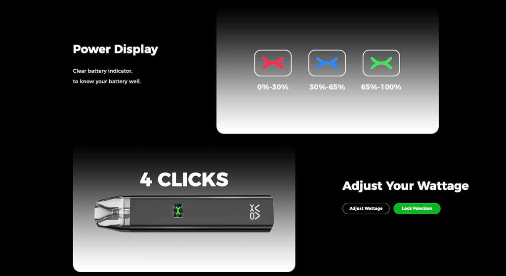 The Oxva Xlim C Pod Kit provides you with button activation and draw activation. There is a LED indicator seat on the fire bottom, which will reveal the battery life with different colour(red for 0%-30%, blue for 30%-65%, green for 65%-100%). No complex navigation operation, you just press one single button for safety locking, switching smart modes, and firing. If you want to manually adjust your wattage, simply click the button four 4 times.